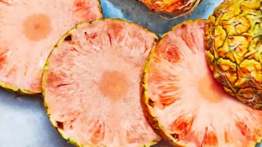 粉菠萝的果肉并不是人工染色的结果,而是受自身所含的番茄红素的影响。其实,所有菠萝在成熟前都含有番茄红素,同时也含有能将番茄红素转化为β-胡萝卜素的酶,在它的作用下,番茄红素不断减少,β-胡萝卜素逐渐增加,果肉最终呈现出黄色。